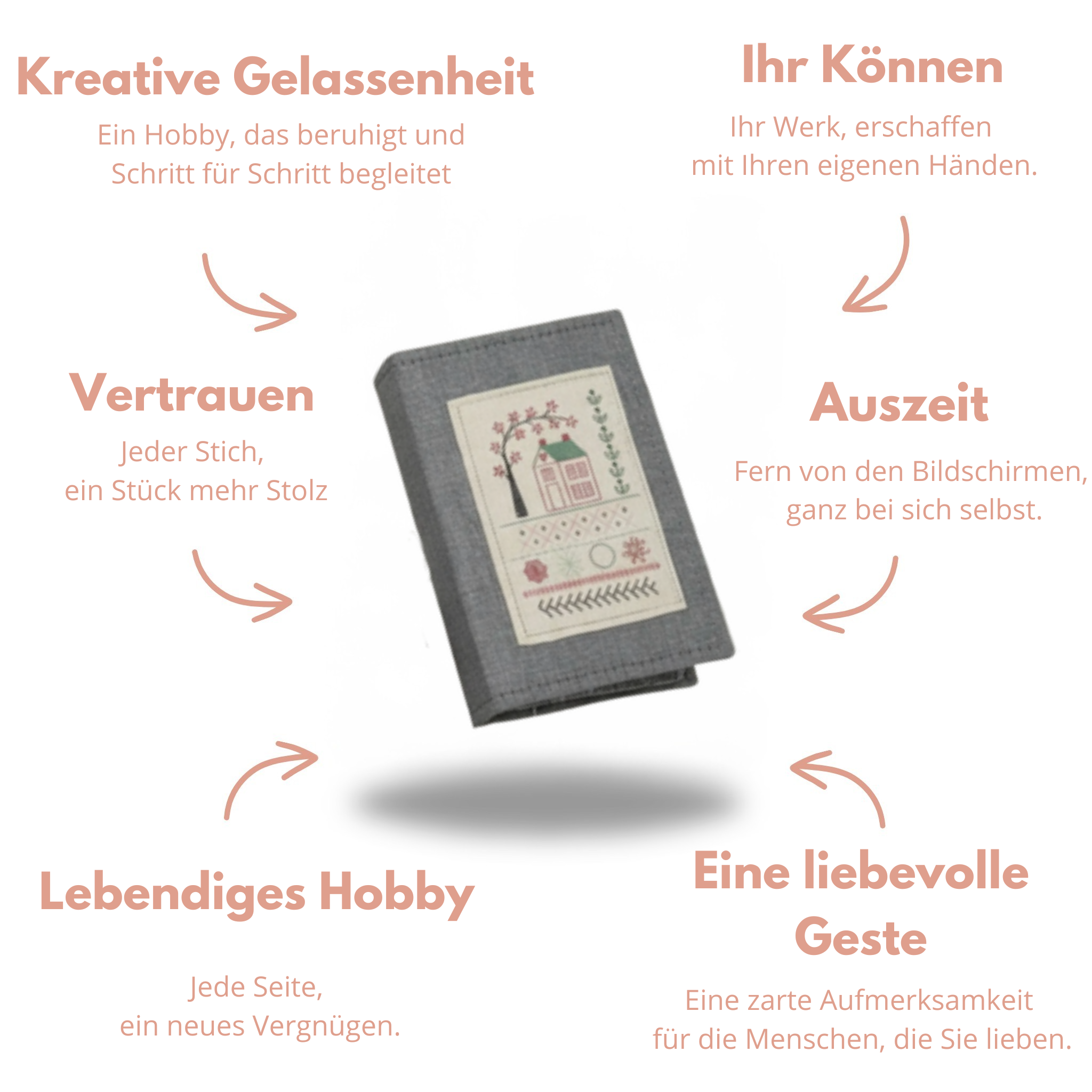 BrodyBook ist ein kompaktes Stickset mit vorbedruckten Motiven auf hochwertigem Stoff.